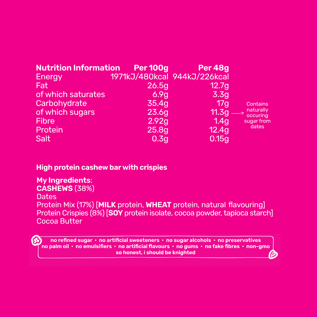 | Nutritional Info | Per 100g | Per Bar (48g) |