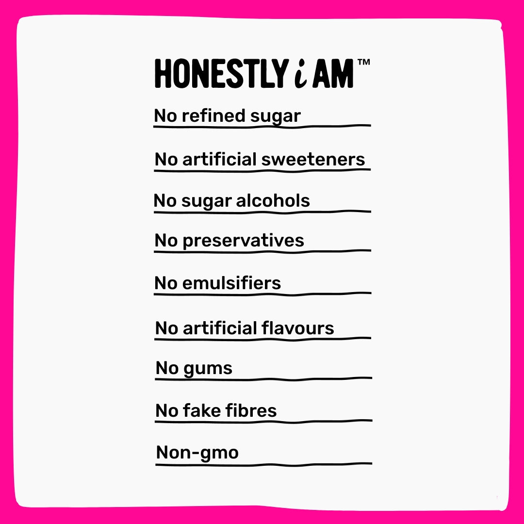 No refined sugar • No artificial sweeteners • No sugar alcohols • No preservatives • No emulsifiers • No gums • No artificial flavours • No palm oil • No fake fibres • Non-GMO